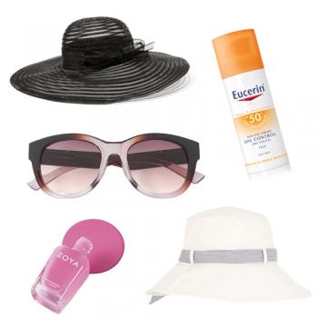 Slamnik Marella (69 €), kremni gel za zaščito pred soncem Sun Oil Control Dry Touch ZF 50 Eucerin (17,23 €), sončna očala Stradivarius (12,95 €), lak za nohte Eden Zoya (12,40 €), klobuček Accessorize(24,90 €).