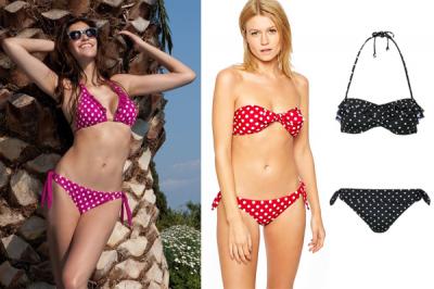 Dvodelne kopalke Party Cheek by Lisca (39,80 €), bikini set French Connection (52,05 €), kopalke C&A (modrček 12 €; hlačke 4,50 €)