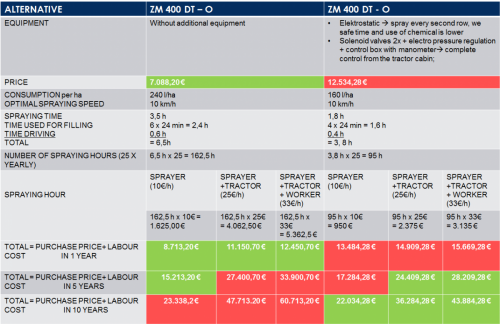 The comparison shows, that the cost of machine with additional equipment for easier and better work break even in compare with a machine with standard equipment after 8,5 years. Furthermore, this calculation doesn't include the cost of fuel and PPP which are significantly lower (up to 50%) in case of using the machine equipped with additional features. In case that our comparison would also include fuel and PPP cost, we would see that the higher purchase price brings return on investment before the end of the third year. This advantage isn't the most significant advantage. Beside the cost reduction, the most important is finding the »time window« for spraying.