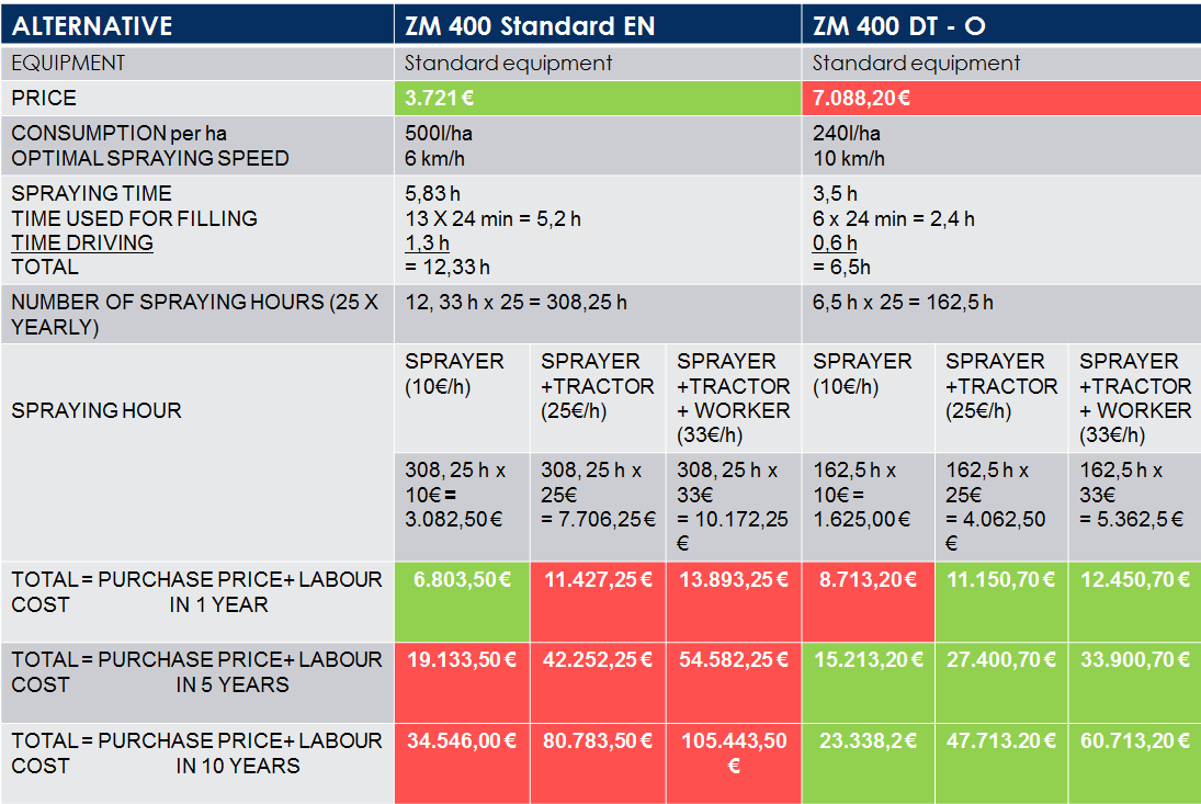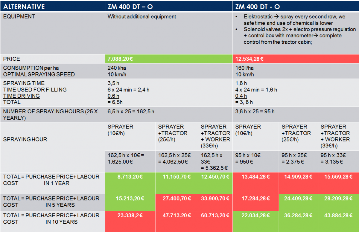 The comparison shows, that the cost of machine with additional equipment for easier and better work break even in compare with a machine with standard equipment after 8,5 years. Furthermore, this calculation doesn't include the cost of fuel and PPP which are significantly lower (up to 50%) in case of using the machine equipped with additional features. In case that our comparison would also include fuel and PPP cost, we would see that the higher purchase price brings return on investment before the end of the third year. This advantage isn't the most significant advantage. Beside the cost reduction, the most important is finding the »time window« for spraying.