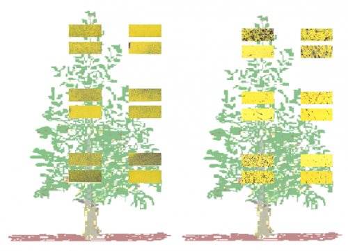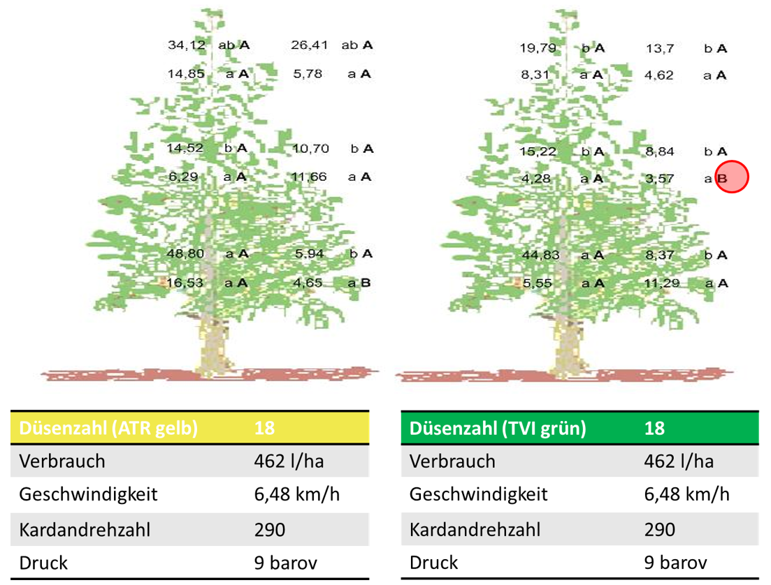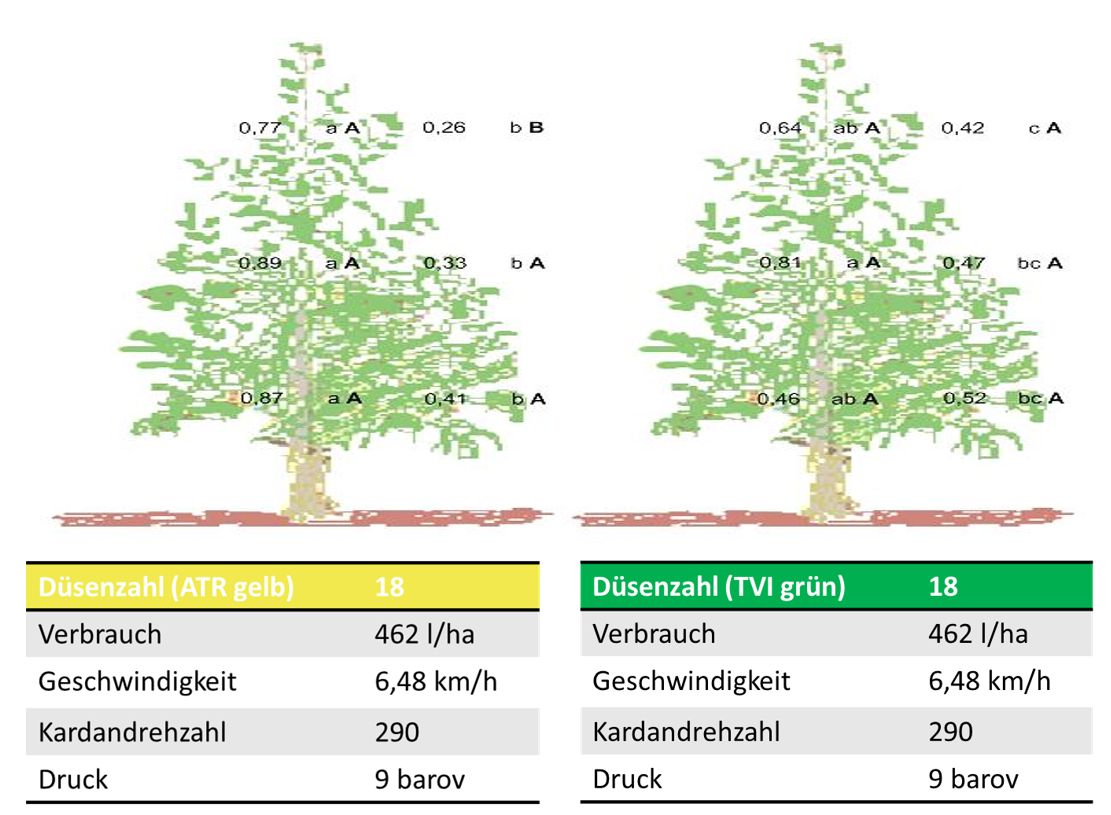 Auch im Jonagold Plantage könnten wir sehen, dass Anwendung von anti-drift Düsen Ausgleiche in normalisierten Ablagerungen zwischen verschiedenen Punkten in Krone verursacht. Das ist besonders gut für Wirkung von PSM. Sehr wichtig ist auch, dass es damit sehr wenig schlecht gesprühte „Baumteilen“ gib, wo sich Schädlinge bilden können.