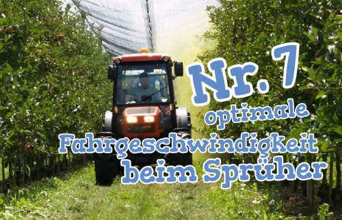 In der Literatur über die Thema Arbeitsgeschwindigkeit bei Sprühen könnten wir einen interessanten Satz finden: »Speed doesn’t kill, but time is money.« Es ist sehr wichtig richtige (schnellst mögliche) Arbeitsgeschwindigkeit zu finden um dann Geschwindigkeit und der Zeit, wenn die Anlage zu Sprühen ist, richtig anzupassen. Das bedeutet, die Kombination zu finden, die enorm wichtig für effektives Pflanzenschutz ist (Niederholzer 2015).