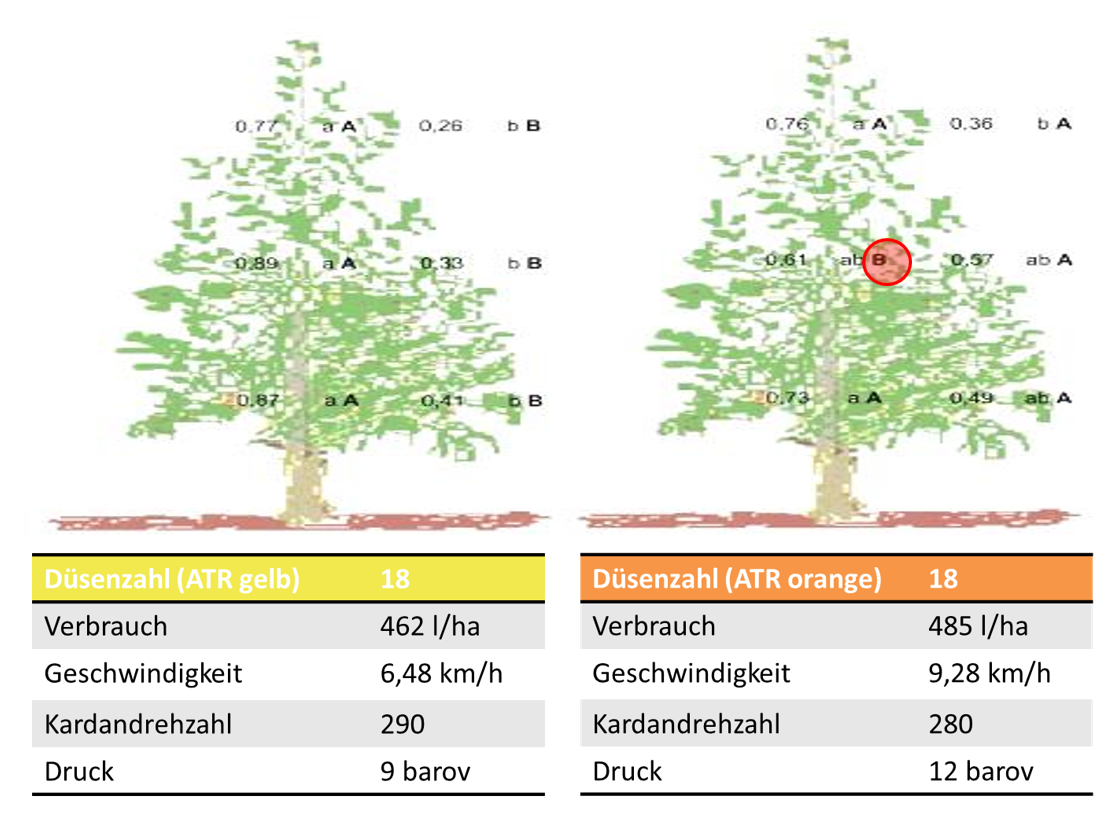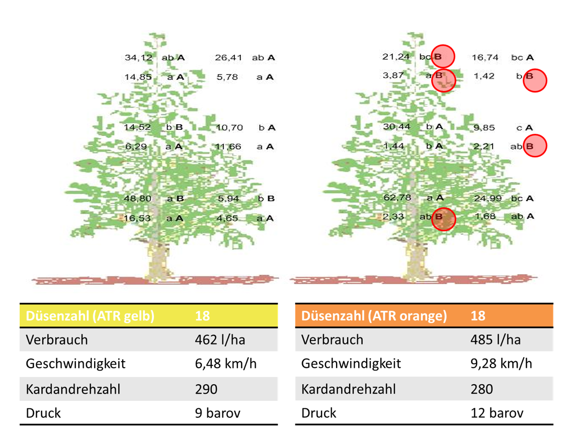 Die Bedeckungen würden miteinander statistisch vergleicht mit Hilfe von Software SPSS, die es uns ermöglicht, eine Analyse der Interaktion zwischen Ablagerung in verschiedenen Teilen der Bäume mit unterschiedlichen Fahrgeschwindigkeiten vorzubereiten. Kleine Buchstaben neben den Daten der Bedeckung sind hilfreich für den Vergleich der Ablagerung von Farbstoff Tracer im gleichen Teil von Bäumen bei nur einer Fahrgeschwindigkeit. Großbuchstaben zeigen Unterschiede in der Ablagerung zwischen den Bäumen der gleichen Form (in gleichen Teil) bei unterschiedlichen Fahrgeschwindigkeiten.