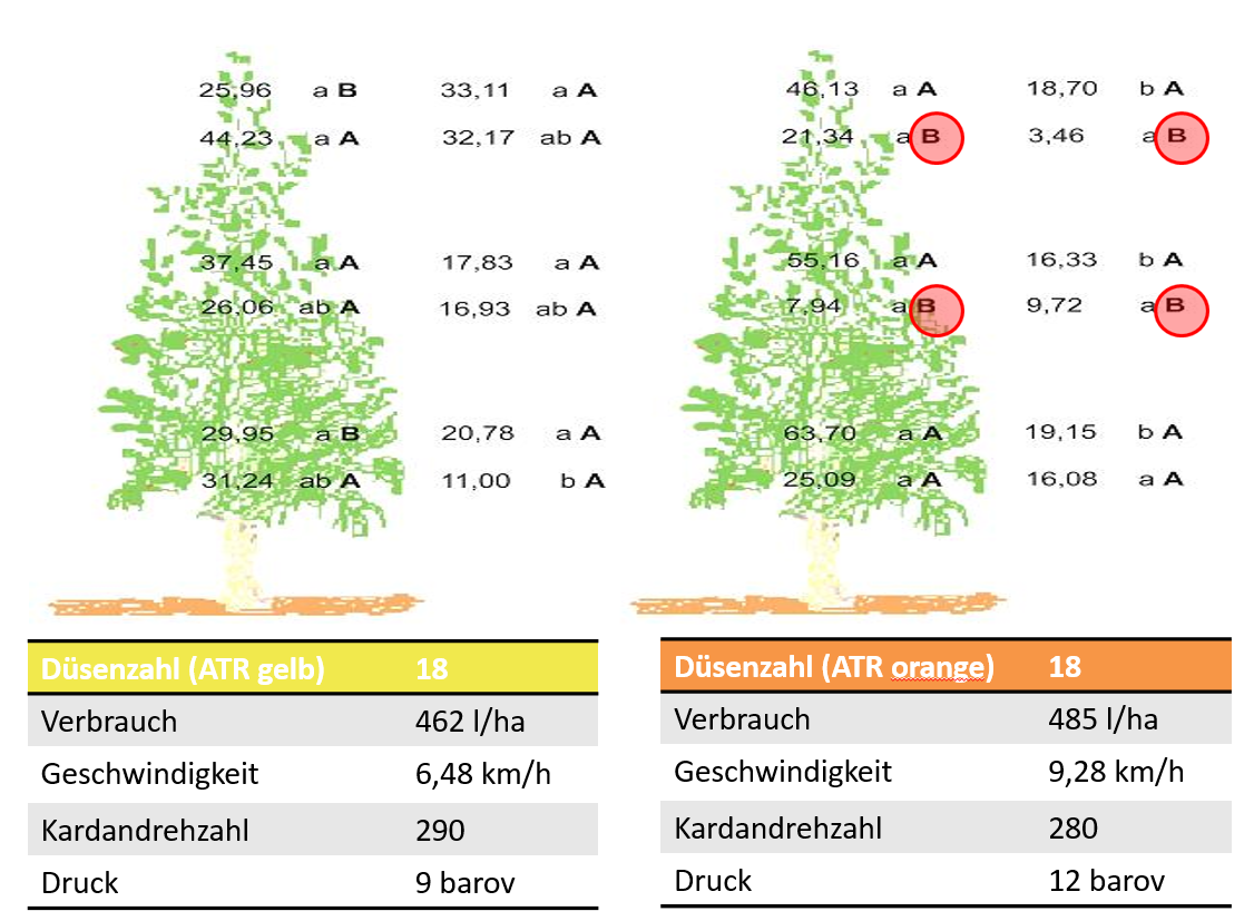Die Bedeckungen würden miteinander statistisch vergleicht mit Hilfe von Software SPSS, die es uns ermöglicht, eine Analyse der Interaktion zwischen Ablagerung in verschiedenen Teilen der Bäume mit unterschiedlichen Fahrgeschwindigkeiten vorzubereiten. Kleine Buchstaben neben den Daten der Bedeckung sind hilfreich für den Vergleich der Ablagerung von Farbstoff Tracer im gleichen Teil von Bäumen bei nur einer Fahrgeschwindigkeit. Großbuchstaben zeigen Unterschiede in der Ablagerung zwischen den Bäumen der gleichen Form (in gleichen Teil) bei unterschiedlichen Fahrgeschwindigkeiten.