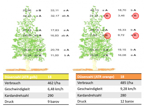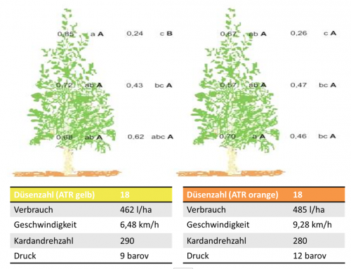 Bei unserem Experiment mit erhöhte Arbeitsgeschwindigkeit (von 6 km/h auf 9 km/h) hat sich die Qualität der Ablagerung durchschnittlich nicht deutlich verschlechtert. Das zeigen kleine Unterschiede in normalisierte Ablagerung in verschiedenen Punkte der Bäume bei 6km/h und 9 km/h.