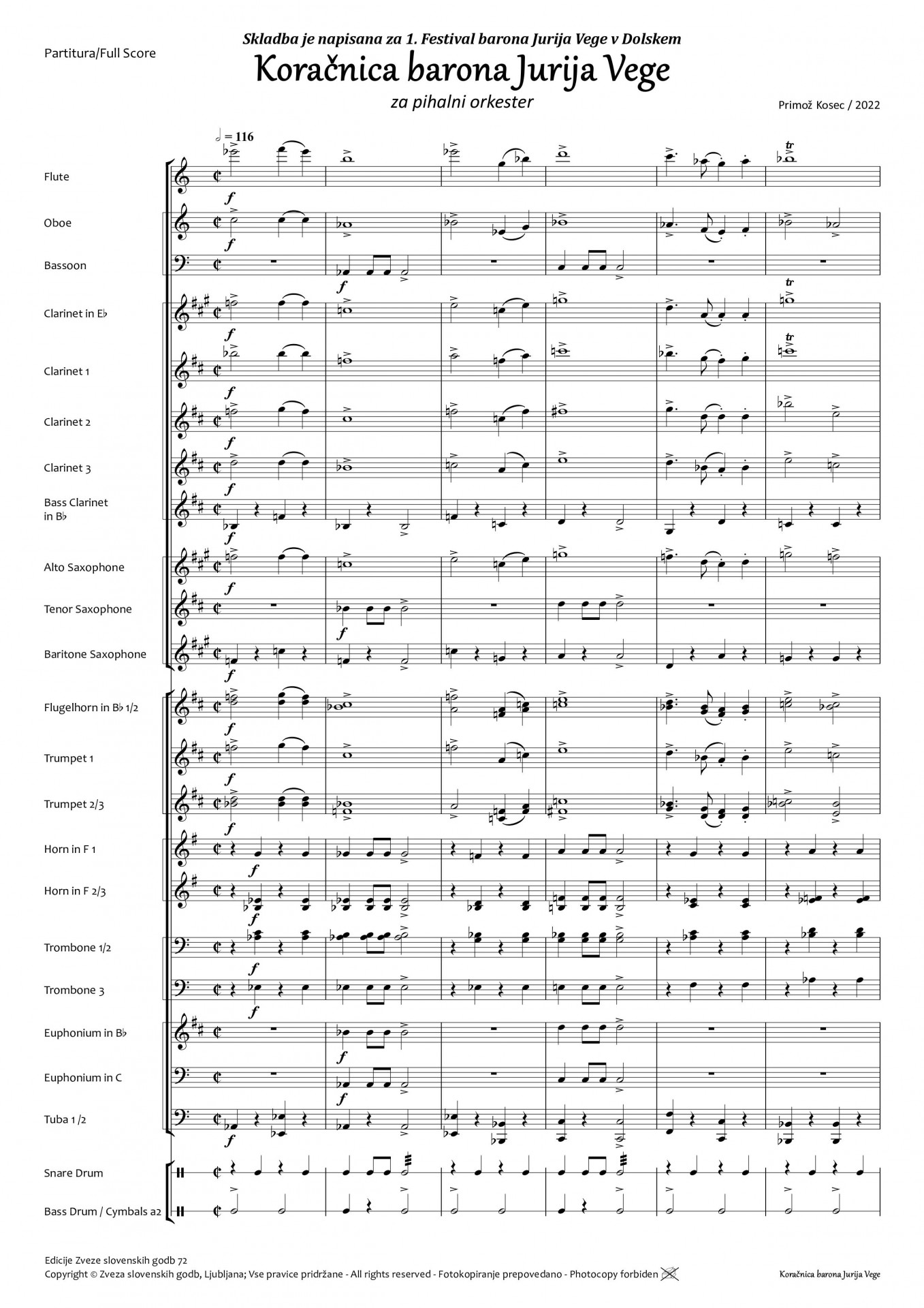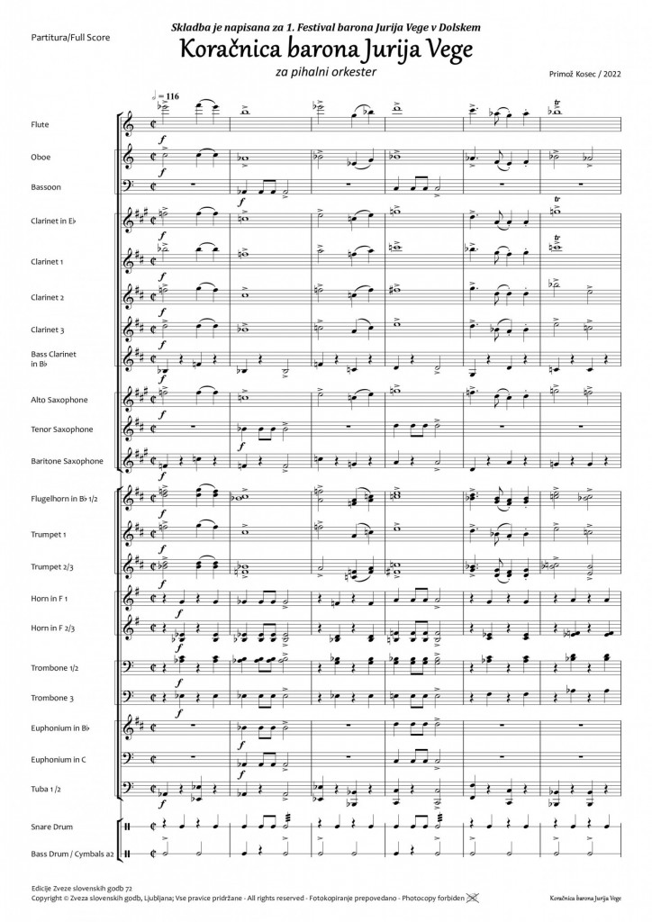 a) Vse sodelujoče godbe izvedejo obvezno koračnico, Primož Kosec: KORAČNICA BARONA JURIJA VEGE (Edicije ZSG, 72)