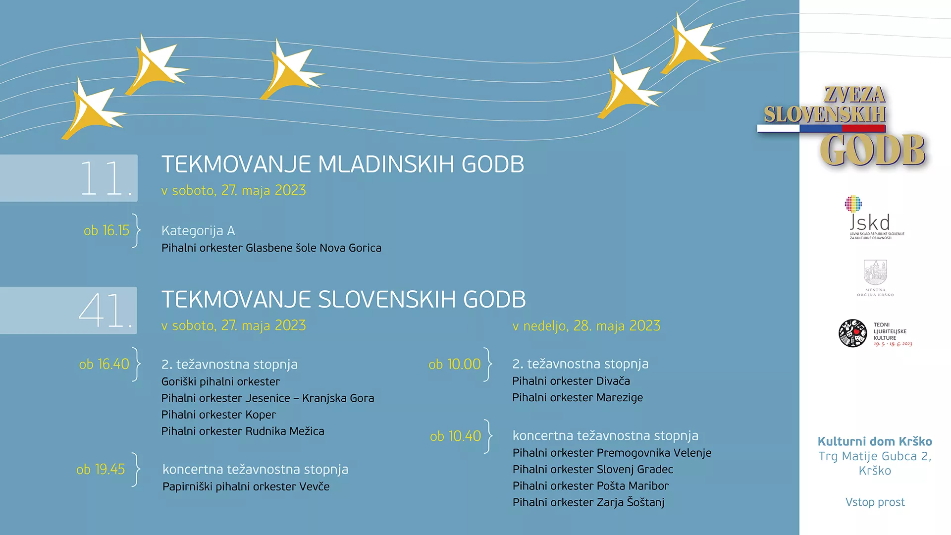Vsak orkester odigra 2 obvezni skladbi ter skladbo po izbiri.