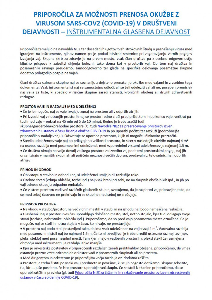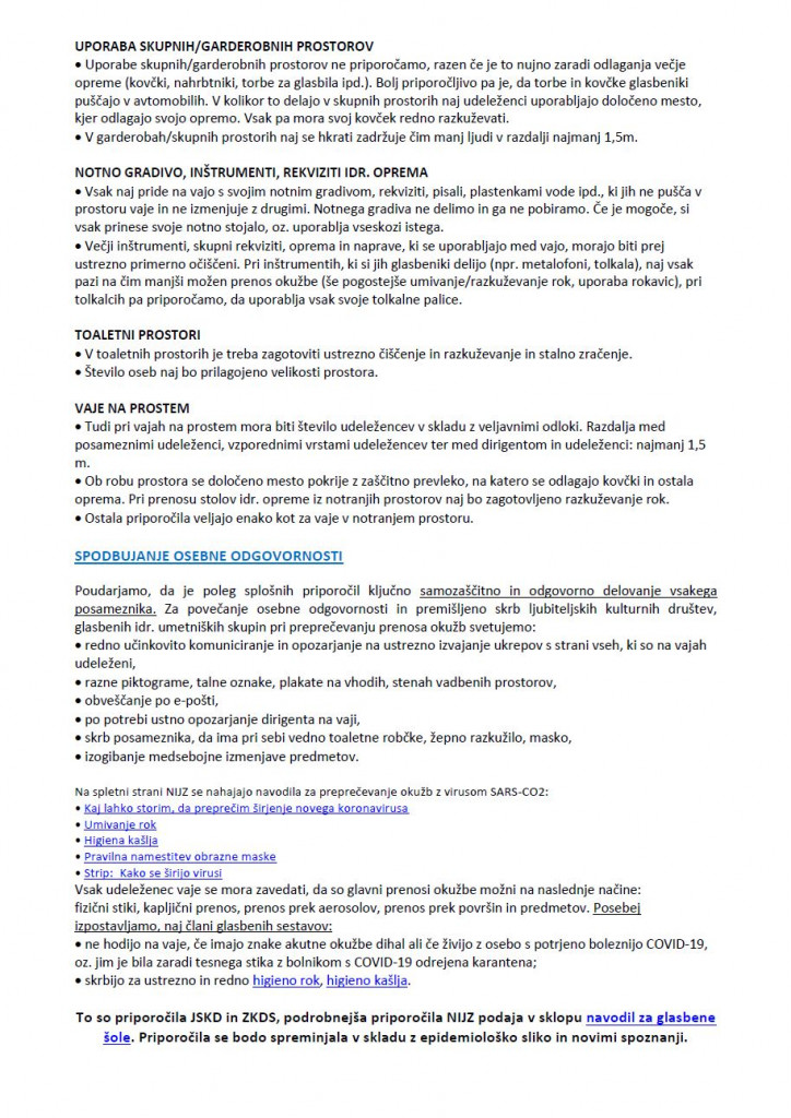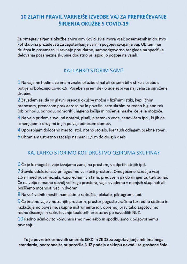 Po objavah forografij godb na družbenih omrežjih tudi na ZSG opažamo, da v praksi nekatere godbe ne upoštevajo navodil in priporočil. Pozivamo vas, da vaje godbe izvajate samo v primeru, ko lahko zadostite vsem spodaj navedenim priporočilom in hkrati vse našteto upoštevate tudi v času odmorov in po zaključeni vaji (druženje).