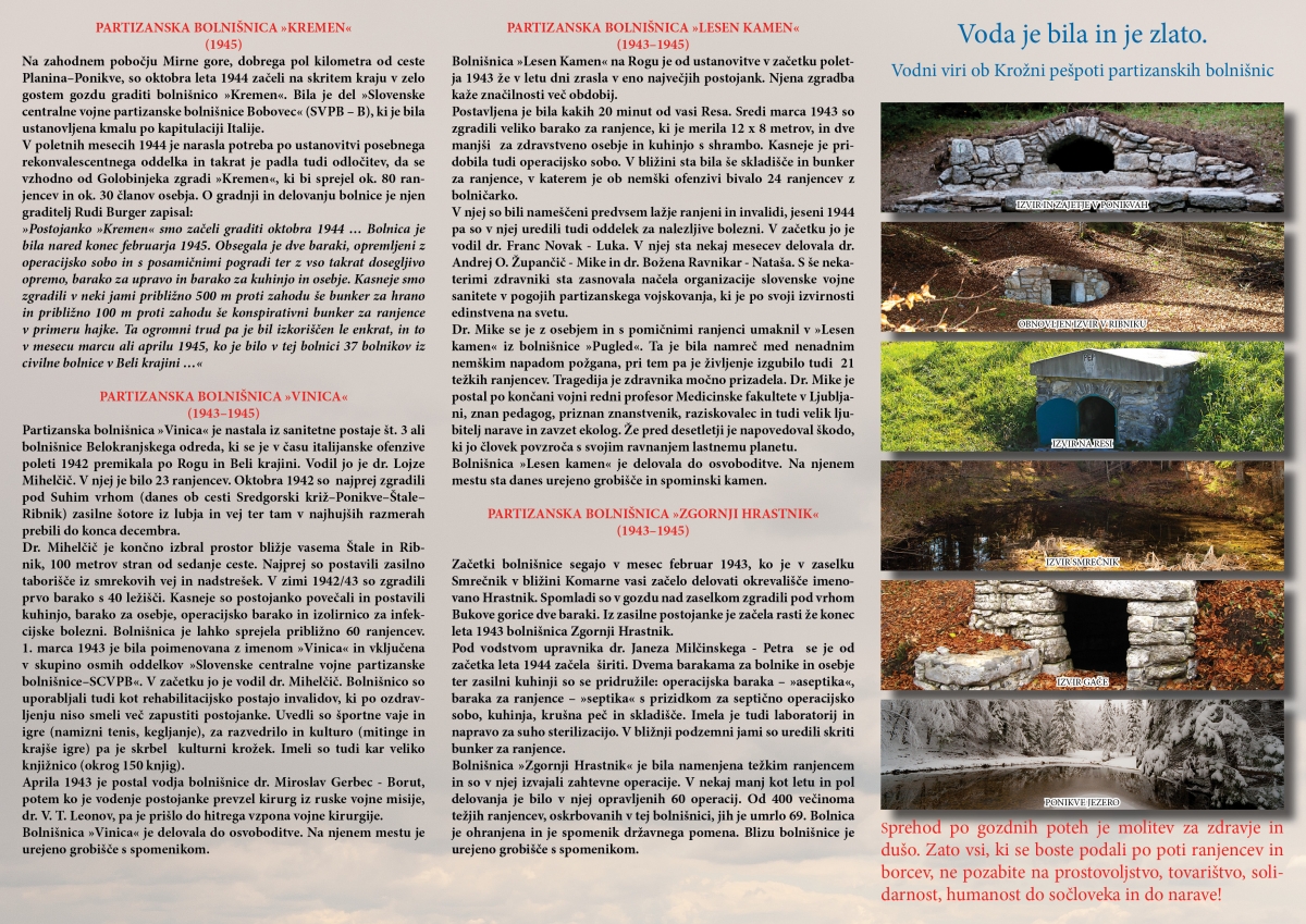 Sama pot ni zahtevna in poteka deloma po stezah, gozdnih vlakah in po gozdnih cestah. Ob ogledu lokacij partizanskih bolnišnic naj vašo pozornost zaslužijo številni vodni viri in zanimive rastline, dolini Ponikve in Ribnik, izredno lepo urejena Resa. Lepo se imejte na poti.