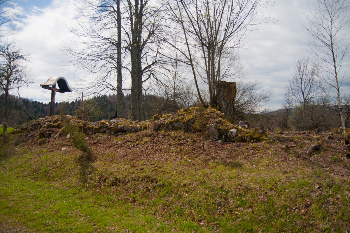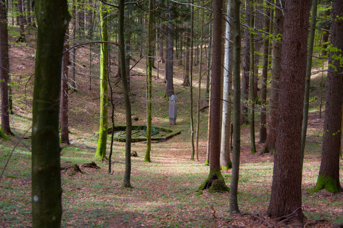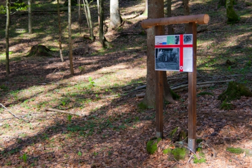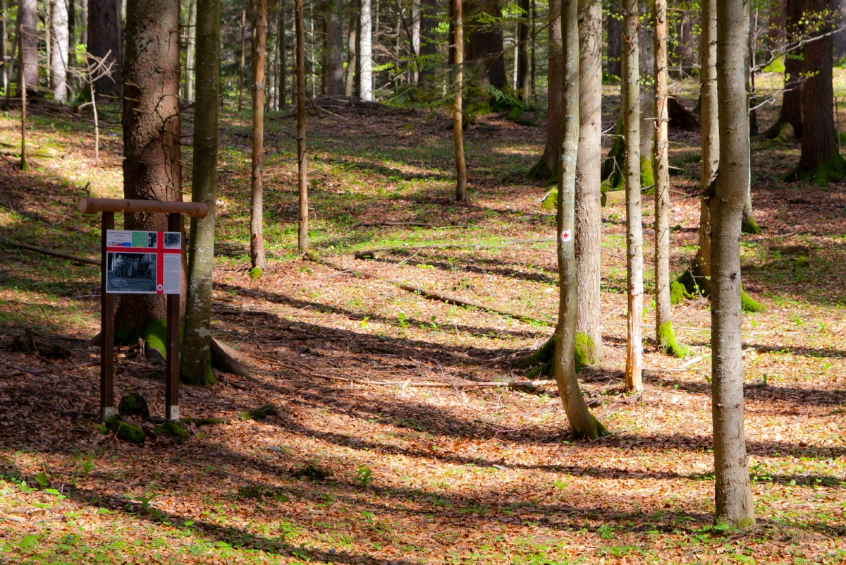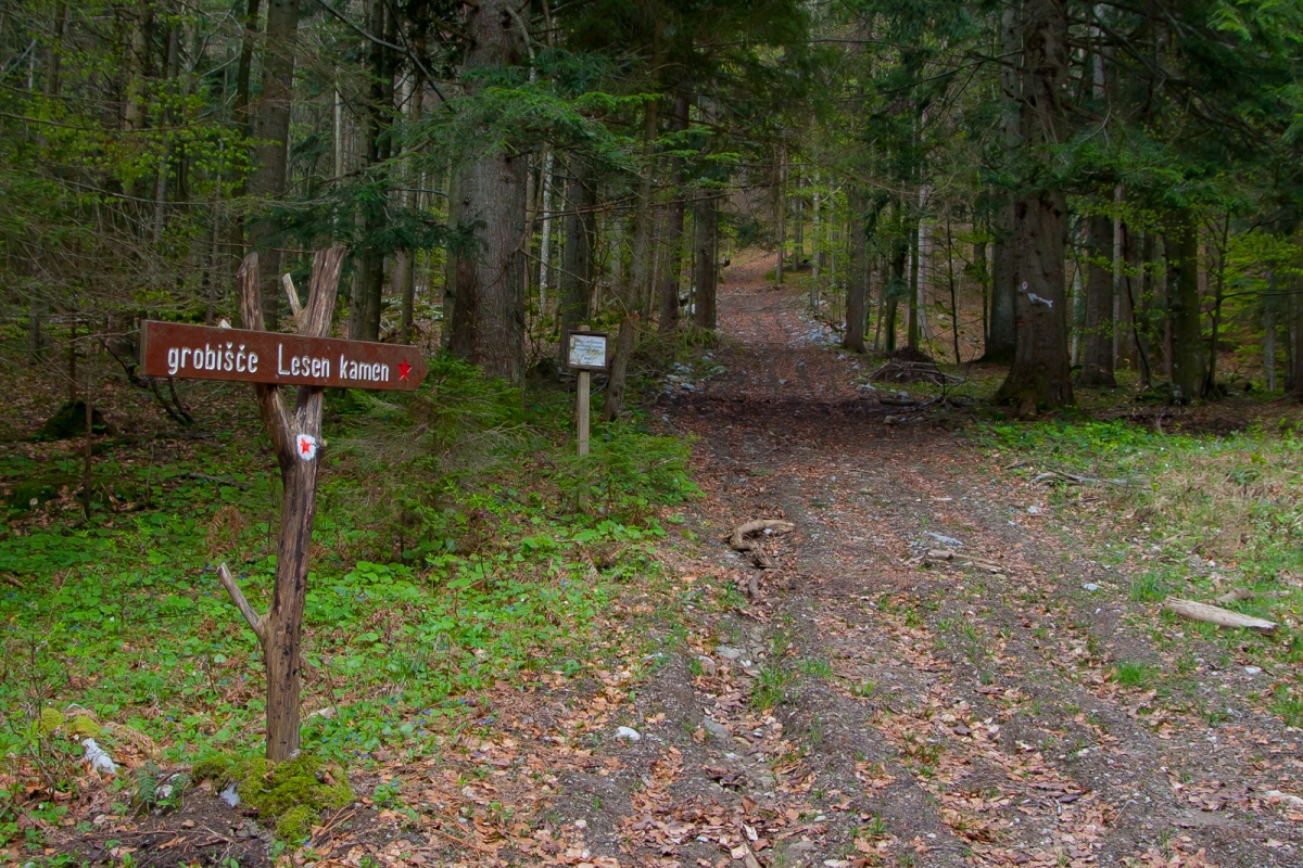 Kmalu s ceste zavijemo desno (glej markacije!) po travniku v gozd in po gozdni vlaki do bolnišnice Lesen kamen. Na info tabli zvemo, kaj se je dogajalo na lokaciji, kjer je danes ohranjeno grobišče in spomenik.