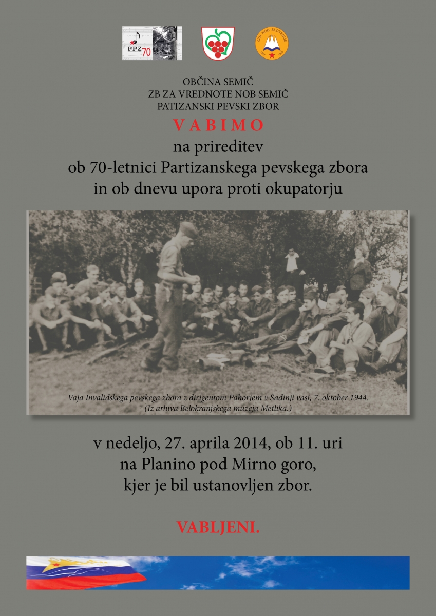V danes razpadajoči hiši v naši neposredni bližini je bil 2o. aprila 1944 ustanovljen Invalidski pevski zbor. V začetku pomladi, kot novo rojstvo in upanje okrevajočih ranjencev – partizanov. Tisti, ki niso mogli več nositi orožja so se borili s pesmijo. Pojoča četa 17. fantov pod okriljem očeta zbora skladatelja Karola Pahorja je prizadevno vadila v kmečki izbi ene od domačij. Tudi po več ur dnevno. S pesmijo so bodrili borce, ranjence in prebivalce po vsej Beli krajini in na območju Kočevskega roga. Bili so edinstveni zbor v takratni vojskujoči se Evropi. Njihov dirigent je takrat skladal pesmi tudi za vsakdanjo rabo, ki so danes že ponarodele: Na juriš, Komandant Stane, Pesem jetnika itd. Njegovo mesto je januarja 1945 prevzel skladatelj Pavel Šivic. Gostovali so med ranjenimi partizani v Bariju in v osvobojeni Ljubljani. V tem obdobju je nastal njihov železni repertoar, ki ga sestavljajo popularne borbene pesmi, večinom a pisane prav zanje. Nekaj let po vojni so le občasno nastopali. Leta 1952 pa sta ga z imenom Partizanski invalidski pevski zbor obnovila Pavel Šivic in Janez Kuhar. Po prenehanju delovanja v zboru invalidov pa se je preimenoval v Partizanski pevski zbor kot se imenuje še danes. 28 let ga je vodil Radovan Gobec in z njim imel več kot 1000 nastopov doma in v tujini. Zbor je imel preko 80 pevcev, danes jih ima še 40 in harmonikarja Braneta Sladiča. Dirigent zbora je prof. Franc Gornik. Vsega skupaj so imeli več kot 2000 nastopov, zadnja leta pa po 30 do 40 na leto. V zadnjih letih so izdali 2 kaseti, CD in pesmarico. Prepevajo partizanske in domoljubne pesmi iz zgodovine zadnjih 100 let, ko se je slovenski narod boril za svoj obstoj - za svobodo in človečnost.
